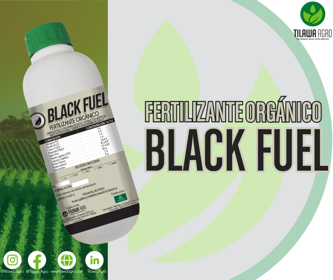 Black Fuel es un bioestimulante coadyuvante orgánico mineral, presentado como líquido soluble de aplicación directa al suelo, por vía fertirrigación o por vía foliar. El Black Fuel procede de extractos vegetales recalcitrantes con alto nivel de carbono orgánico (materia orgánica) oxidable y principalmente como ácidos fúlvicos, y en forma secundaria como ácidos húmicos y aminoácidos, y menormente trazas de varios elementos. El Black Fuel es un abono orgánico mineral muy útil para una agricultura sustentable y ecológicamente equilibrada. La principal ventaja del Black Fuel (por su riqueza en ácidos fúlvicos) es su alta capacidad de quelatizar cationes debido a la alta CIC y de actuar como un agente acomplejante y como un inhibidor de cristalizaciones salinas. Además, fisiológicamente sobre las plantas mejora los procesos de germinación, mejora el enraizamiento, mejora la permeabilidad de las membranas aumentando la penetración de iones y condiciona un efecto estimulante antiestrés causado por altas cargas salinas, déficit de agua, quemas por plaguicidas, entre otros. En conjugación con plaguicidas con alto valor de Koc como el glifosato y paracuat, el Black Fuel potencia su acción sobre las malas hierbas impactando positivamente en el costo del control, en la contaminación ambiental y el efecto residual en el suelo.